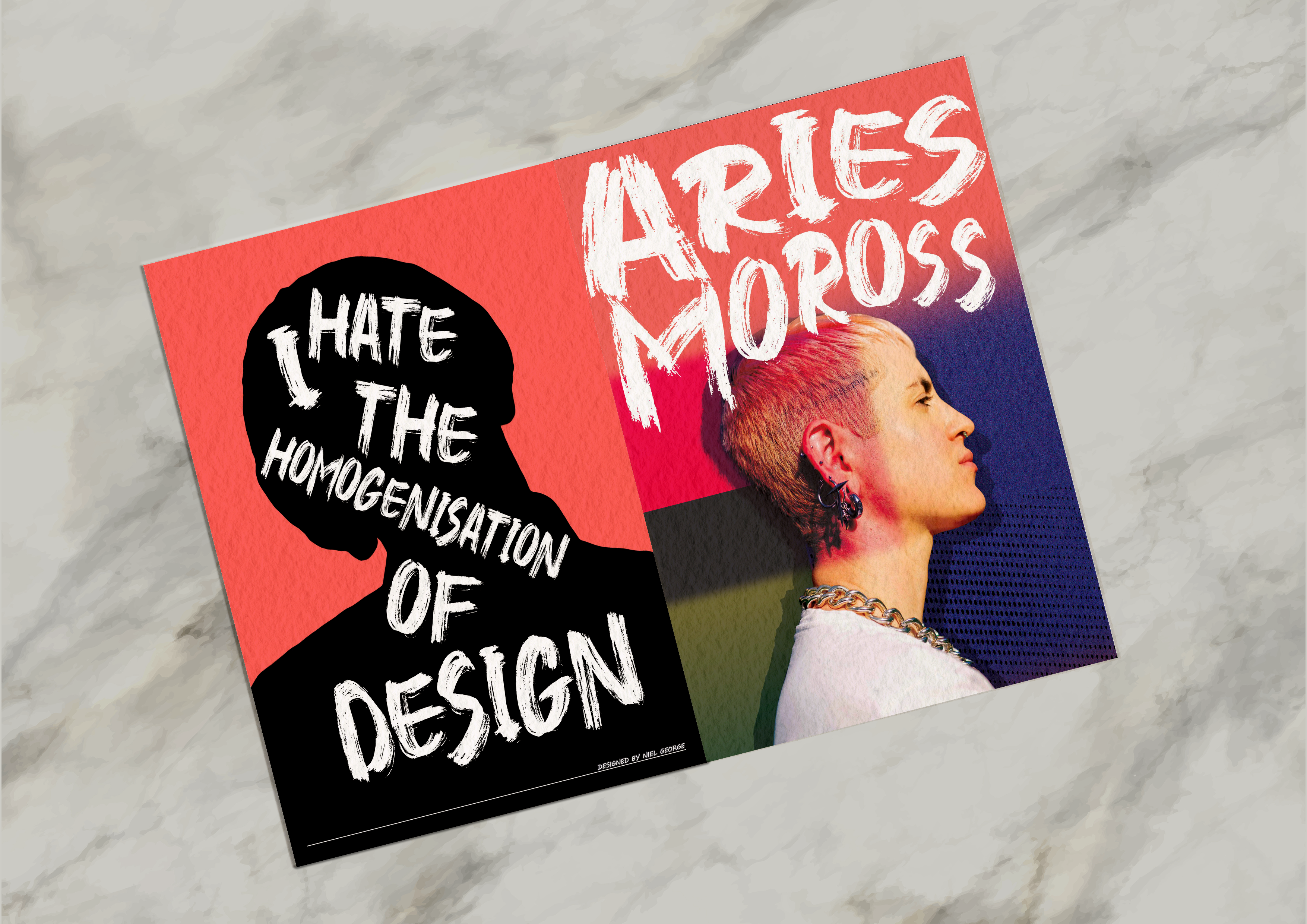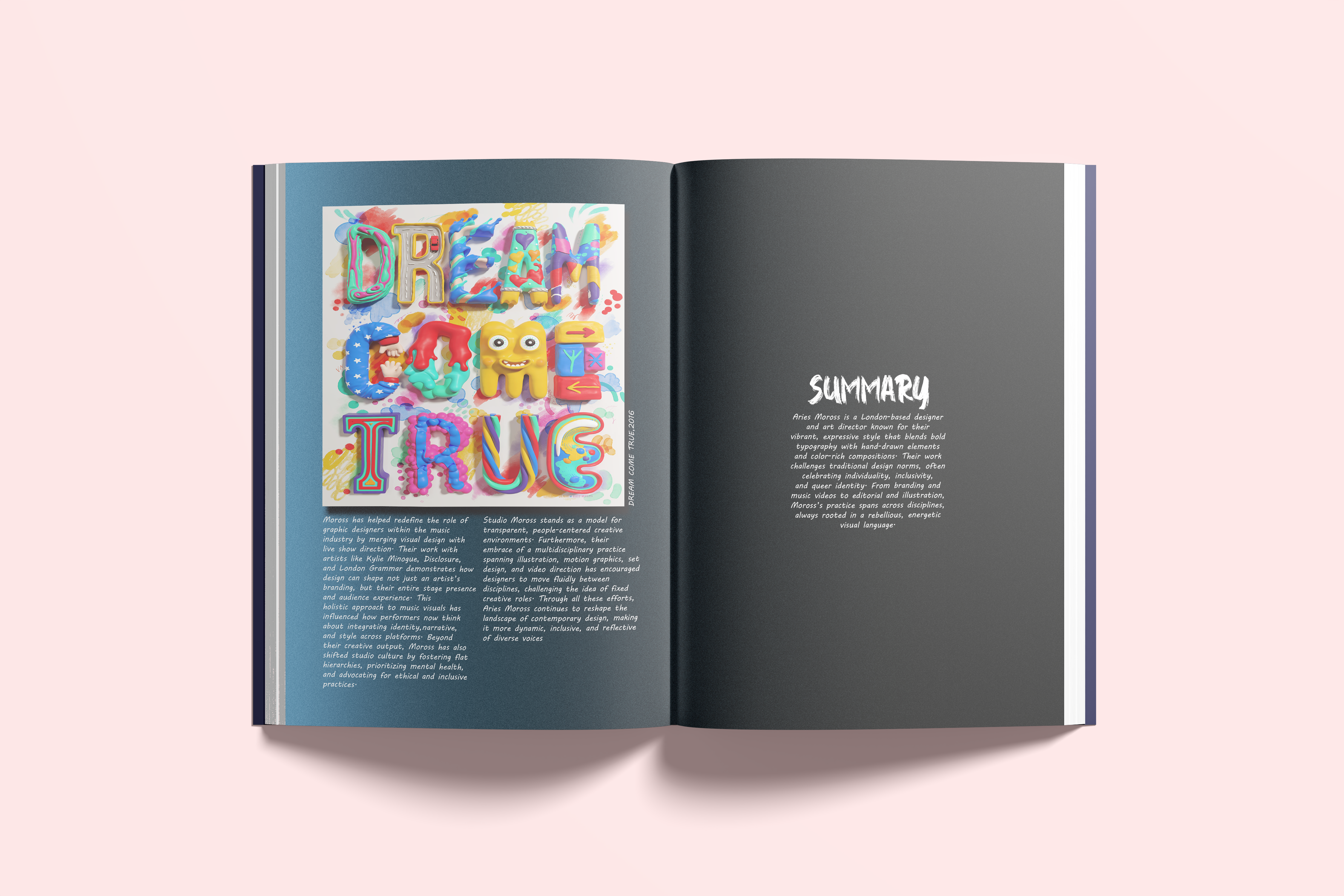 Aries Moross works as a designer, artist, and creative director. Moross started their career in 2007 by creating hand-drawn flyers for the independent music scene in London. In 2008, they started a record label that exclusively released vinyl records. They established Studio Moross in 2012 because they were eager to grow their practice and assemble a staff. They have remained closely associated with the music industry throughout their career, but they have also ventured into the fields of art and creative direction. With projects ranging from album promotions to live performances, Moross has served as creative director for a variety of clients, including pop acts and DJs. Notable customers include London Grammar, Jessie Ware, Spice Girls, Disclosure, H.E.R., and Kylie Minogue.